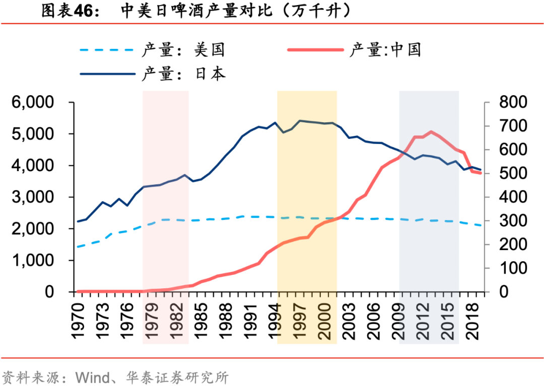 人口老龄化平滑量增曲线,14年啤酒行业踏入存量期。作为啤酒消费主力,我国15-64岁人口占比于2010年达到峰值74.5%,随后持续下行,至19年占比近70.6%,对标美日,其啤酒产量分别在80/90年代人口拐点附近出现,我国主力消费人群占比下滑亦将驱动啤酒量增逻辑弱化,2013年我国啤酒产量见顶下行,正式踏入存量期,此外,以下因素亦限制了啤酒行业空间:1)新世代啤酒消费习惯变迁:90后消费者较父辈更加注重健康、品质、适度,饮酒量下降;2)啤酒替代品多元:除传统消费较多的白酒及啤酒,近年来国外传入的红酒、预调鸡尾酒等成为新时尚,选择多元化分流啤酒消费。站在当前时点,我国啤酒行业已迈入存量时代,并对行业竞争、公司战略带来重要影响。