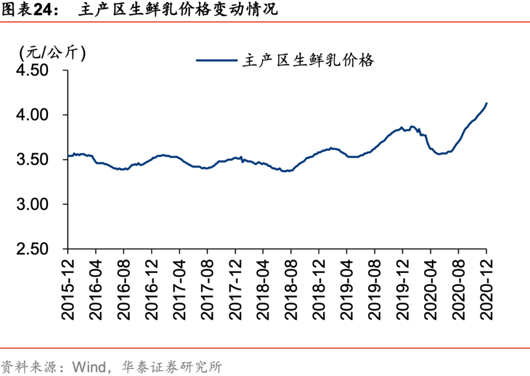 1)子类产品均价稳步提升。根据商务部数据,我国牛奶和酸奶的零售均价明显攀升,其中牛奶从2009年5月初的7.63元/升提高至2020年底的12.39元/升,酸奶则从2009年5月初的9.80元/千克稳步提升至2020年底的15.56元/千克;