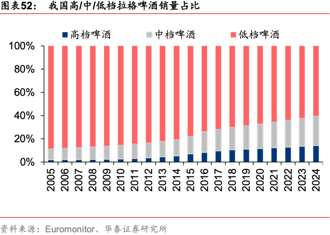 需求端:消费升级成强劲拉力,啤酒行业高端化加速演化。需求端看,2001-2019年中/美/日三国人均GDP复合增速为12%/3%/1%,我国收入的高速增长为行业高端化提供强大需求支撑。销售端,08年起高档啤酒代替中档啤酒成为增长主力并持续领涨,销量占比由08年的2%提升至19年的11%,Euromonitor预测,考虑疫情影响,20-24年高/中/低档啤酒销量CAGR分别+4%/+3%/-6%,至2024年,销量占比达14%/21%/67%,高端化进程持续推进。