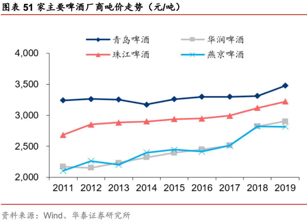 5月起主要原材料价格上涨,行业涨价潮可期。据青岛啤酒19年年报,在啤酒生产成本中包材/酿酒原材料占比达51%/25%,在酿酒原材料中,麦芽占比高达83%,原材料价格对厂商定价及利润影响大。17-18年由于环保限产导致玻璃、纸装等包材价格上涨,主要啤酒厂家纷纷提价,时隔十年行业再迎涨价潮,而在行业增量有限、龙头市占率基本稳定的背景下,价格战意义不再,龙头定价权提升,4个主要啤酒产商(华润/青岛/燕京/珠江)2018-2019年吨成本同比+5.9%/-0.4%,吨价同比+6.3%/+3.6%,盈利能力改善。20年5月,由于澳麦“双反”,商务部决定自5月19日起对澳麦征税,反倾销税率73.6%,反补贴税率6.9%,根据Wind数据,5-10月份,国内大麦价格上涨7%,瓦楞纸价格及中国玻璃价格指数由于下游需求恢复价格呈V型反转,分别上涨15%/42%,成本上涨有望带动行业再迎涨价潮。