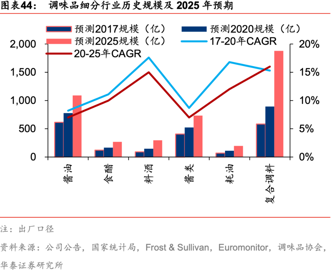 (二)泛全国化传统品类:我们认为料酒与蚝油处于全国化普及阶段,两者无显著的口味区域特征,在龙头企业的培育下享有高成长红利,预期未来渠道渗透率提升,根据Frost& Sullivan预测,料酒/耗油行业市场规模2020-2025年复合增速有望达15%/12%。