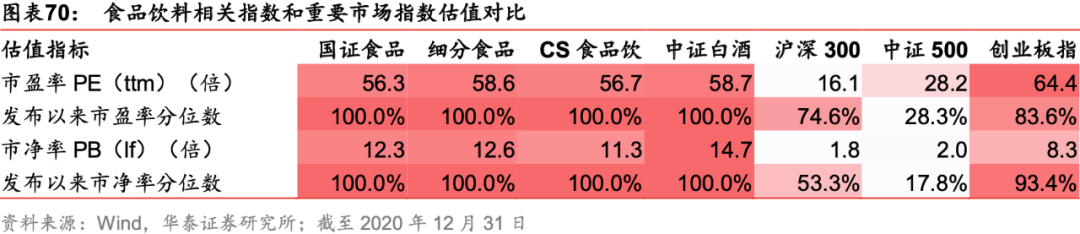 横向考察2020年12月31日食品饮料相关主题指数和重要市场指数的估值指标以及各指数发布以来分位数,如下表所示。国证食品饮料行业指数市盈率低于创业板指,略低于细分食品、CS食品饮和中证白酒,高于沪深300和中证500指数。国证食品饮料行业指数市净率低于细分食品和中证白酒,高于其余可比指数。
