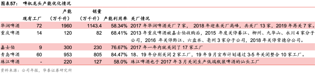 需求见顶下产能利用率下滑,龙头加速产能优化,“关、建”并举。根据Wind,05-15年啤酒行业共新增年产能达4338万吨,而年消费量仅新增1729万吨,产能利用率低下严重拖累啤酒厂商的盈利能力,14年啤酒销量见顶进入存量时代后,行业掀“关厂潮”,关停辐射能力弱、可替代性强、运行效率低的工厂;高端化进程扩大运输半径,继续推动生产集约化。华润啤酒CEO侯孝海2020年11月26日在《坚持去产能提质增效,推动高质量发展》中表示,随着消费升级带来啤酒吨价上升及物流持续发展,运输费用率将持续下降,啤酒瓶的运输半径由150公里扩展至300-400公里,一个省的消费量只需要一个啤酒厂产能即可覆盖。当工厂覆盖区域随运输半径增加而重叠时,厂商会对重叠区域的工厂进行整合,规模化带动生产效率提升。