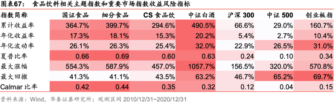 统计区间内(2010年12月31日至2020年12月31日)国证食品饮料行业指数表现和其它相关主题指数表现接近,整体优于沪深300、中证500、创业板指等主要宽基指数。计算指数收益风险指标,国证食品饮料行业指数的年化收益率、年化波动率和最大回撤均低于中证白酒,与细分食品和CS食品饮接近;夏普比率和其它相关主题指数接近,优于主要宽基指数。食品饮料行业这一优质赛道在过去十年具备显著的Alpha特征,我们认为拥有长期配置价值。