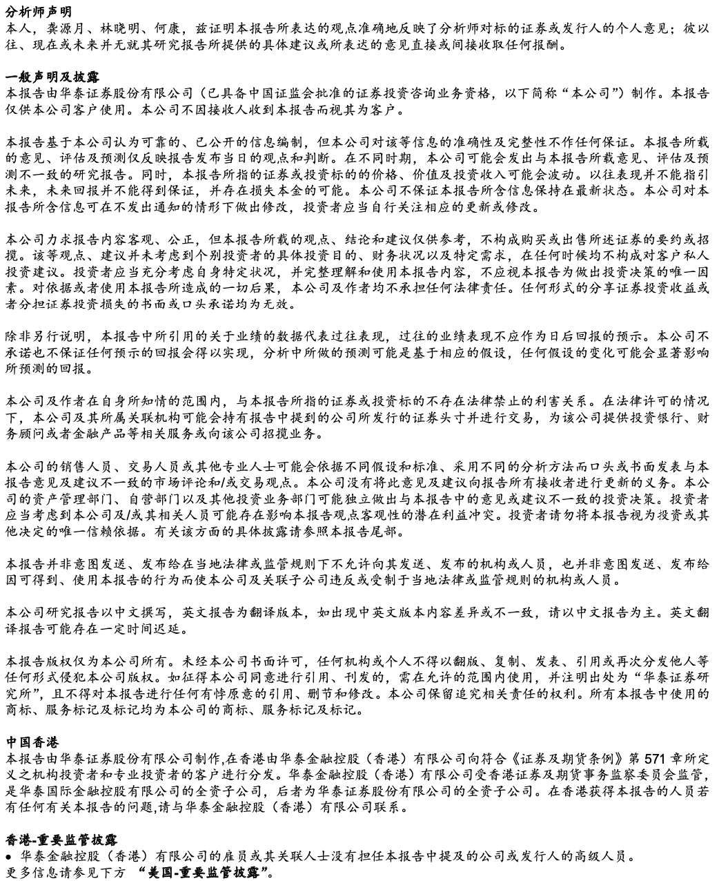 本公众平台不是华泰证券研究所官方订阅平台。相关观点或信息请以华泰证券官方公众平台为准。根据《证券期货投资者适当性管理办法》的相关要求,本公众号内容仅面向华泰证券客户中的专业投资者,请勿对本公众号内容进行任何形式的转发。若您并非华泰证券客户中的专业投资者,请取消关注本公众号,不再订阅、接收或使用本公众号中的内容。因本公众号难以设置访问权限,若给您造成不便,烦请谅解!本公众号旨在沟通研究信息,交流研究经验,华泰证券不因任何订阅本公众号的行为而将订阅者视为华泰证券的客户。