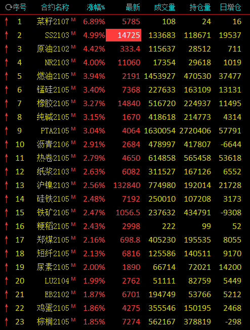 热点栏目1月7日,国内期市早盘大面积上涨,不锈钢涨停,能化品涨幅居前,原油、20号胶涨逾4%,燃油涨近4%,橡胶、纯碱、PTA涨逾3%,纸浆涨逾2%;黑色系大涨,锰硅涨逾3%,热卷、硅铁、铁矿石、动力煤涨逾2%;贵金属走跌,沪银、沪金跌逾1%。