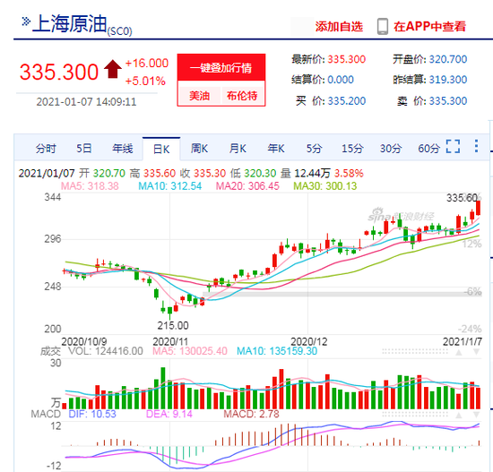 热点栏目1月7日,国内原油期货主力合约单边上行,大涨5%,报335.5元/桶。