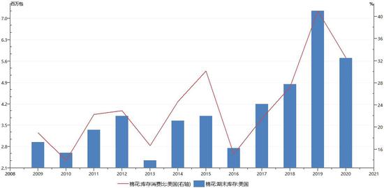 2020/21年度,全球棉花期末库存环比调减390万包,原因是产量减少和消费量增加。全球棉花产量调减220万包,原因是美棉产量大幅调减,同时印度和巴基斯坦产量减少了50万包,而且其他国家也有小幅调减。全球消费量调增160万包,为1.156亿包,同比增长13%。印度消费量调增100万包,中国调增50万包,巴基斯坦和泰国也有相应调增。全球棉花进口量调增30万包,中国和巴基斯坦的增加完全抵消了孟加拉国、泰国和印尼的减少。全球期末库存预计为9750万包,同比减少190万包。