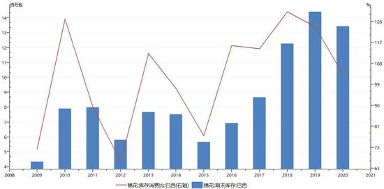 根据美国农业参赞的最新报告,2020/21年度巴西植棉面积为150万公顷,同比减少10%,产量263万吨,同比减少13%。植棉面积下降的原因是天气干旱导致大豆播种推迟、竞争作物价格高以及棉花生产成本增加。