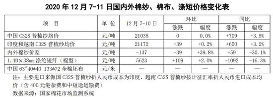 随着下游逐渐进入年底补库阶段,推动皮棉成交数量有所增加,国内棉价小幅抬高。2020年12月中旬,代表内地标准级皮棉市场价格的国家棉花价格B指数均价14461元/吨。代表全国主产棉省(区)白棉3级籽棉折皮棉均价的中国棉花收购价格S指数均价12917元/吨(不含加工费)。代表进口棉中国主港到岸均价的国际棉花指数(M)均价81.62美分/磅,折人民币进口成本13394元/吨(按1%征税计算,含港杂和运费),国际棉价比国内棉价低1067元/吨。