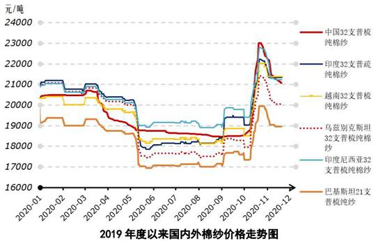 价格方面:轧花厂及贸易商反映新棉销售提速,挺价销售意愿增强,下游纺织市场有所改善,年末临近纺织企业陆续小批量采购原料,部分纺织厂反映近日春夏订单下达数量增多,企业对后市普遍持谨慎乐观态度。近期外纱市场活跃,内外纱竞争态势不断加剧。市场乐观情绪升温和供需局面偏暖将给予棉价明显支撑,后期需重点关注国内棉农下年度植棉意向对行情走势变化的影响。