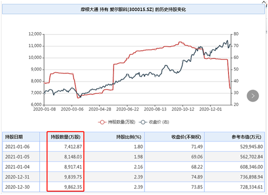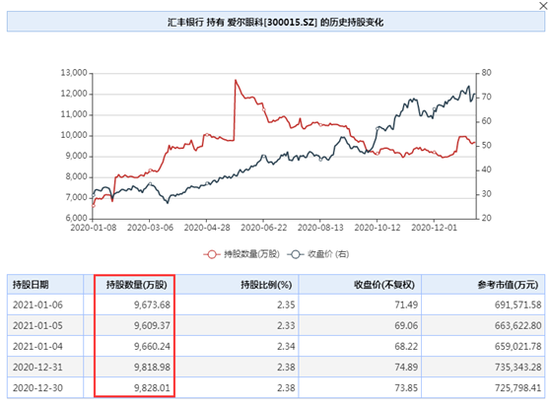 与艾芬医生的医疗纠纷发生后,这些外资股东在操作上有什么变化呢。Wind数据显示,1月4日当天,汇丰银行、摩根大通和渣打银行均减持了爱尔眼科的股票,不过有意思的是,汇丰在4日、5日连续减持后,在6日又增持了60多万股,目前汇丰持有爱尔共9673.68万股,持股市值约69亿元(截至1月6日)。而摩根大通和渣打银行两家,近日持续减持,尤其是摩根大通,减持幅度较大。