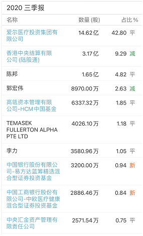 作为A股首家民营医疗机构的爱尔眼科,其股东中不乏知名机构。截至2020年9月30日,爱尔眼科前十大流通股东中包括高瓴资本、淡马锡富敦投资、易方达、中欧医疗健康基金等。不过这些都是2020年3季度的数据,又过了一个季度,这其中发生了哪些变化我们不可得知。