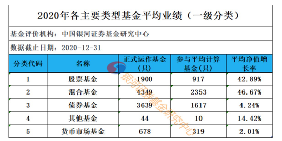 另一可参考的是公募基金业绩。据银河证券基金研究中心数据,2020年股票基金收益率42.89%,混合基金46.67%,债券基金4.24%,货币市场基金2.01%。