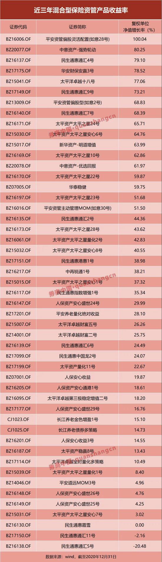 从2018-2020年的3年业绩看,49只混合类保险资管产品中,有1只收益率超过100%。即平安资管偏股灵活配置(如意28号),收益率为100.04%。
