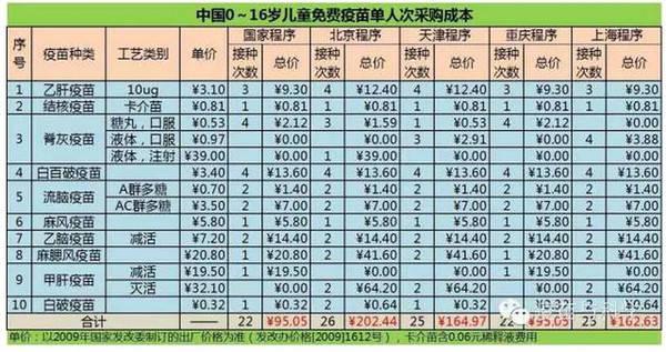 中国0-16岁儿童接种的所有免费疫苗采购成本,每名儿童需要95元