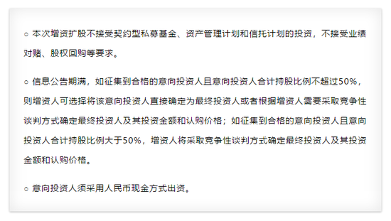 ○ 本次增资扩股不接受契约型私募基金、资产管理计划和信托计划的投资,不接受业绩对赌、股权回购等要求。