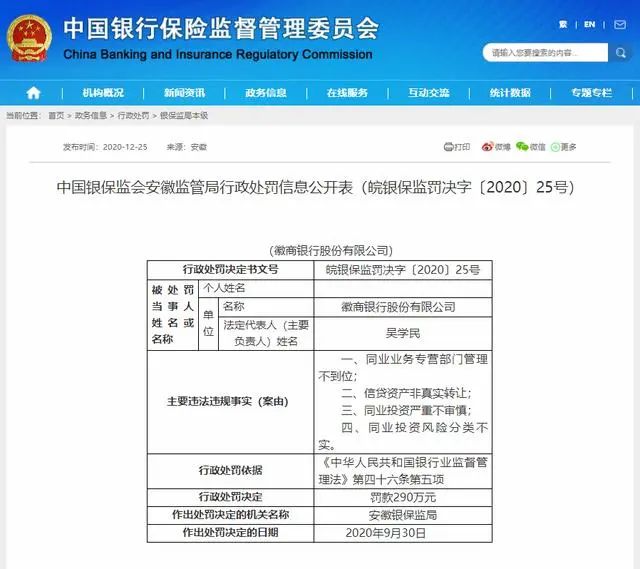 而这次被处罚,徽商银行股份有限公司主要违法违规事实有4项:同业业务专营部门管理不到位、信贷资产非真实转让、同业投资严重不审慎、同业投资风险分类不实。因违反了《中华人民共和国银行业监督管理法》第四十六条第五项,徽商银行被处以罚款290万元的行政处罚。该处罚决定的日期为2020年9月30日。