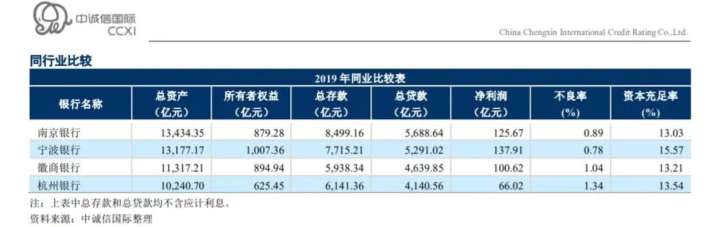 在同日披露的评级报告中,中诚信国际表示,徽商银行的资金主要来源于客户存款和同业资金融入。从债务结构来看,截至 2019 年末,该行总存款在总负债中占比 56.98%,以公司存款和活期存款为主;同业负债和同业存单在总负债中合计占比31.05%。