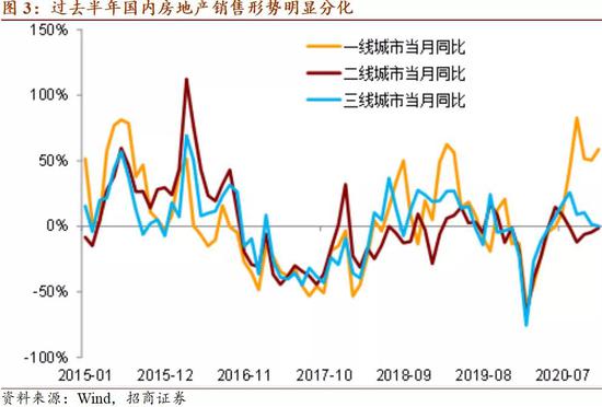 去年下半年以来,房地产销售形势出现明显分化。这体现在两方面:其一,从销售增速水平看,一线城市明显领先二三线城市,过去半年1线城市销量同比平均增速未49.8%,而二线和三线城市的平均增速仅为-2.8%和10.7%;其二,从销售增速的趋势看,二线城市降幅持续收窄,三线城市增速持续放缓,一线城市冲高回落。二线城市销售形势对全国房地产销售影响程度最高,2020年二线城市房地产销售占比为45.3%。过去半年,二线城市销售增速降幅显著收窄,从9月的-12%收窄至12月的-1.3%,而且12月一线城市销售增速又反弹至58.8%。因此,尽管三线城市销量增速快速下滑,但12月全国房地产销售形势将延续改善势头。