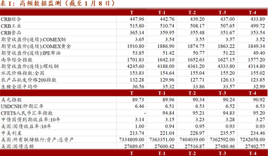 本周,CRB指数持续走强,1月7日CRB综合指数收盘449.2,较上周同期上升5.4,CRB工业收盘517.5,较上周同期上涨6.8,CRB食品收盘366.0,较上周同期上升3.9。南华综合指数1月8日收盘1724.2,较前一周同期上升79.2。1月8日农产品批发价格200指数收盘133.3,较上周小幅回升。生猪全国平均价1月8日收盘36.4元/公斤,较上周上升2.28%。本周,COMEX铜收盘均值3.7,较上周上升3.0%;COMEX黄金本周收盘均值1910.8,较上周上涨1.3%;IPE布油收盘均值53.9,较上周上升4.7%;螺纹钢期货收盘均值4245.6,较上周上涨1.4%。水泥价格指数1月8日收盘153.6,较上周同期下降0.97。