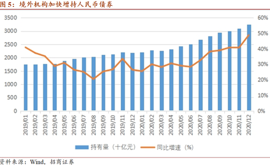 5.中国金融开放提速,国际资本显著流入。在我国金融市场对外开放进程提速与中美利差走阔等多重因素的影响下,国际投资者逐渐加大了对中国债券市场的投资力度。中央结算公司数据显示,境外机构已连续25个月增持人民币债券。2020年,人民币债券境外机构净增持规模达到10671亿元。预计在中国金融深化开放、人民币升值预期等驱动下,更多的国际资本将配置人民币资产,人民币资产国际化程度有望显著提高。