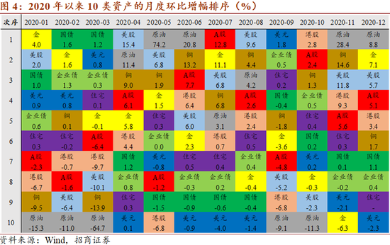 下图呈现了2020年10类资产的月末环比增幅,10类资产分别是沪深300指数、恒生指数、纳斯达克综合指数、中债国债总指数、中债企业债AA指数、美元指数、布伦特原油、LME铜、伦敦现货黄金、百城住宅价格指数。