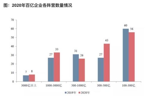 其中,3000亿以上企业增长1家,1000-3000亿阵营企业数量增长6家,而500-1000亿阵营数量则减少5家。