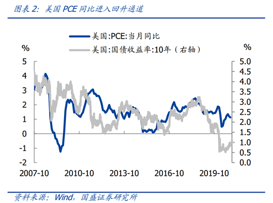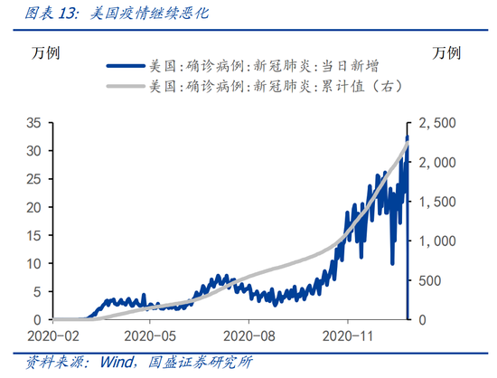 财政刺激将进一步拉大美国供需缺口,并推升了通胀预期和国债利率。财政刺激属于需求端的扩张政策,2020年美国两轮财政刺激政策给居民和企业提供补助,支撑了美国消费的回升,目前美国零售销售已经回到比疫情前更高的水平。美国接下来将继续加大财政刺激,基建投资有望受益,这会继续推动终端需求回升。而美国疫情却迟迟得不到有效控制,新增确诊人数持续攀升,这对美国生产又会产生抑制,美国工业生产离疫情前的水平依然有5%左右的缺口。供需缺口拉大将继续推升美国通胀水平,美国核心PCE同比从4月低点的0.93%已经回升至了2020年11月的1.38%。根据旧金山联储的预测,2021年美国核心PCE将震荡回升至6月左右,高点接近2.3%左右,之后小幅回落。通胀预期也在升温,美国10年期TIPS国债收益率与名义国债收益率之差代表的通胀预期也在年初快速回升。通胀以及通胀预期的回升推动10年国债利率上行。