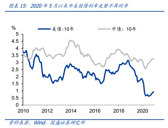 历史上美债利率与国债利率走势较为同步,但并不完全一致,2020年5月以来二者走势出现分歧。二者走势分歧主要是因为两国经济基本面差异导致货币政策取向的不同。中国疫情最早在去年得到控制,由于经济逐步回暖,5月开始货币政策逐步回归常态。而美国疫情一直没有有效好转,美联储至今表态仍将持续宽松,将短端利率维持在0附近,而保持每月1200亿美元的购债计划不变。对应的中国国债利率从5月开始明显反弹,而美国国债利率持续保持在0.6%左右的低位,从10月开始温和上行,2021年以来上行速度有所加快。因而美债利率上行不一定意味着中国国债利率会上行。