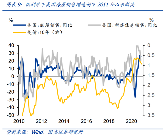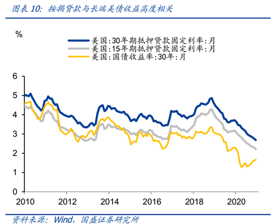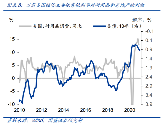 目前美国经济复苏基础尚不稳固,而2013-2014年经济稳步向上,当前需要联储货币政策保持宽松,以维持利率在较低水平。2013年至2014年,美国经济稳步向上,经济景气度较高。美国GDP增速从12年末的1.47%,开始触底回升至了2014年末的2.88%。但当前美国经济复苏情况并不乐观,主要依赖低利率环境对于房地产和耐用品消费的刺激,因而也难以承受利率的上行。房地产为利率敏感型行业,美国按揭贷款利率与美债走势高度相关,美国30年、15年按揭贷款与30年美债相关性极高,美债长端收益率的下调能够带动按揭贷款利率下调,刺激房地产销售。此外,地产属于重资本行业,低利率环境能够降低房地产企业融资成本,增加企业资本开支。从数据开看,2020年7月新屋销售同比增加48.1%,2020年10月成屋销售同比增加26.8%,分别创下2011年以来的增速新高。利率下降同样降低耐用品的信贷成本从而促进耐用品消费。2020年5月美国耐用品消费大幅反弹,10-11月同比增速分别达到15.2%、13.0%,同样为2010年以来增速新高。疫情尚未得控制,美国经济的回升依然不稳固。如果美债利率大幅攀升,则美国经济的复苏势头将可能被中断,当前美国经济尚且不能承受利率的大幅上行。因而联储货币将维持资产购买速度,以维持利率平稳。