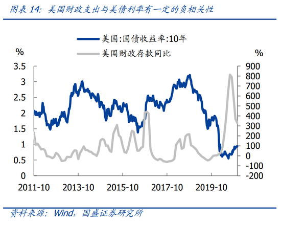 在联储的呵护下,即使美国财政刺激力度将加大,对国债利率推升作用也有限。在美国进入民主党执政之后,财政刺激有望进一步加码。但是巨额的财政刺激一方面需要足够的资金来源,另外一方面需要低利率环境帮助美国政府控制大幅赤字下的融资成本。财政刺激的资金来源一是拜登所提出的向富人加税的再分配政策,二是增加国债发行,后者是主要的方式。因而美国加大财政刺激,带来美债供给增加,而联储一般会“配合”以维持利率稳定,美联储将维持每月800亿元美元的国债购买,短期内不会退出。在联储的配合下,可以看到,财政存款增速变化与美债利率走势没有呈现出显著正相关,而是有一定程度的负相关,因而美国国债供给增加,在联储的配合下,对美债利率的推升作用不会很强劲。