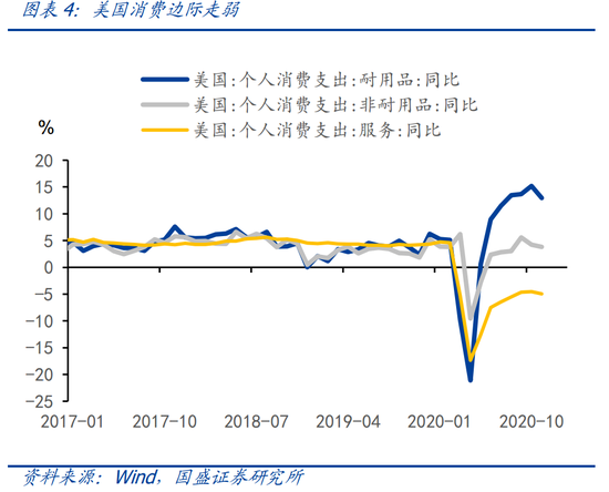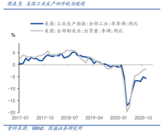 美债利率上行并非来自经济基本面走强。美国经济回升依然缓慢,由于疫情依然在恶化,未来经济前景存在不确定性。美国消费边际走弱,2020年11月耐用品消费、非耐用品消费边际走弱,服务消费则离疫情前依然有不小的差距。而工业生产回升较为缓慢。2020年7月之后,美国工业生产指数和制造业出货量持续处于同比负增长区间,边际收窄幅度不足,截至2020年11月,工业生产指数同比-1.77%,制造业出货量同比-5.7%。美国疫情仍然没有得到有效控制,经济回升的前景并不乐观,并非美国经济走强推动利率上行。