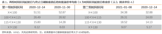 第一,高价位转债后续上涨显著。2020年12月14日后,130元以上(基于2020年12月14日收盘价分组)转债均值出现快速上涨,至2021年1月8日,涨幅接近20%。而其他三组不同价位区间转债均值则出现了不同程度的下跌,其中2020年12月14日收盘价在115元到130元之间的转债,其均值同期下滑近4%。