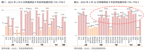 我们认为如果后续抱团风格短期内持续存在,一方面仍需对高溢价率转债有所谨慎,另一方面也建议增加对于二线龙头标的的关注。如果仅从各行业正股指数历史估值分位(PE-TTM)来看,2021年1月8日的各行业估值历史分位整体情况仍与2015年2月14日有所距离,回顾2014-2015年行情,万得全A指数在2014年12月至2015年2月中旬之间经历震荡调整后,再次突破高位。如果简单对比两个时间点各板块历史分位情况,虽然目前部分板块的估值已经处于95%以上的极高历史分位,但目前各板块整体估值情况还是略低于2015年2月14日。