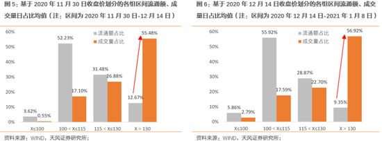 第三,130元以上转债占据过半成交量。无论是在2020年12月上半月还是12月14日至今,在2020年11月30日以及2020年12月14日流通额近占10%左右的130元以上的转债,其后续区间成交量占比分别高达55.48%与56.92%。尤其是2020年12月14日至今,130元以上(取2020年12月14日收盘价)相关转债成交量占比(56.92%)与流通额占比(9.35%)进一步拉大。转债市场资金显著向高价标的移动。
