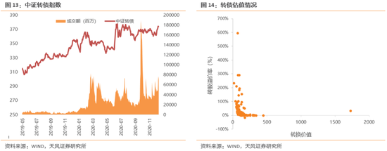 综合来看,目前在2020年12月下旬之后,转债市场一方面跟随股票市场出现结构性“分化”加剧的迹象,另一方面也体现出较强的风险偏好。这其中包含了转债市场对于后续正股市场持续上涨的预期,同时也或包含了部分资金在整体“抱团”下的被动选择。如果正股市场持续抬升,且转债市场风险偏好维持高位,则目前市场的“分化”现象或难以消失,机构对于部分小市值标的的业绩稳健与否可能变得“不太敏感”。