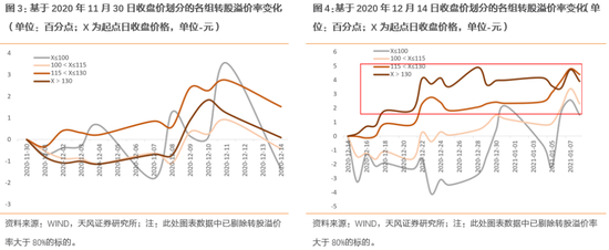 第二,2020年12月14日之后,高价位转债在快速上涨的同时,转股溢价率同样逐步抬升。如果说在2020年12月上半月各价格区间转债的转股溢价率基本处于相似趋势的话,那么从2020年12月14日到2021年1月8日,可以看到130元以上高价位转债的转股溢价率出现了区别多数分组的显著提升。这也反映出在130元以上高价转债上涨的同时,部分标的转股溢价率亦处于扩张过程。转债市场整体投资风格或显现出比正股市场更高的风险偏好。