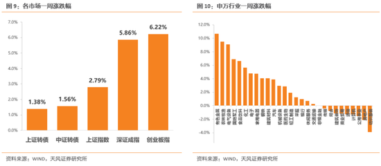截至周五收盘,上证指数报收3570.11点,一周上涨2.79%。创业板指数报收3150.78点,一周上涨6.22%。从股市的行业表现情况来看,多数板块上涨,有色金属、农林牧渔、电气设备三个板块以10.66%、9.51%、9.10%的涨幅位居涨幅榜前三;纺织服装、房地产、公用事业三个板块跌幅最大,分别为-3.89%、-2.13%和-1.52%。
