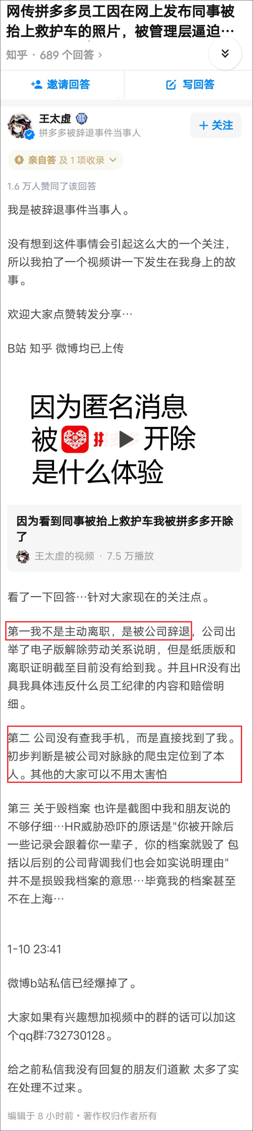 原标题:“因为看到同事被抬上救护车我被拼多多开除了”?拼多多:不是解约原因