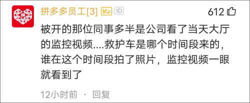 有网友推测,很有可能是拼多多根据救护车在场的时间,通过大厅的监控进行了排查。查看谁在这段时间内拍了照片,然后“揪”出了这位“匿名”的同事(即@王太虚wray)。