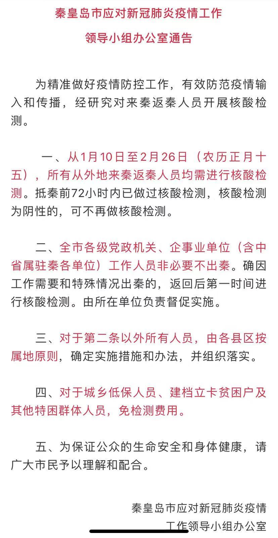 1月9日,秦皇岛市应对新冠肺炎疫情工作领导小组办公室通告,为精准做好疫情防控工作,有效防范疫情输入和传播,经研究对来秦返秦人员开展核酸检测。