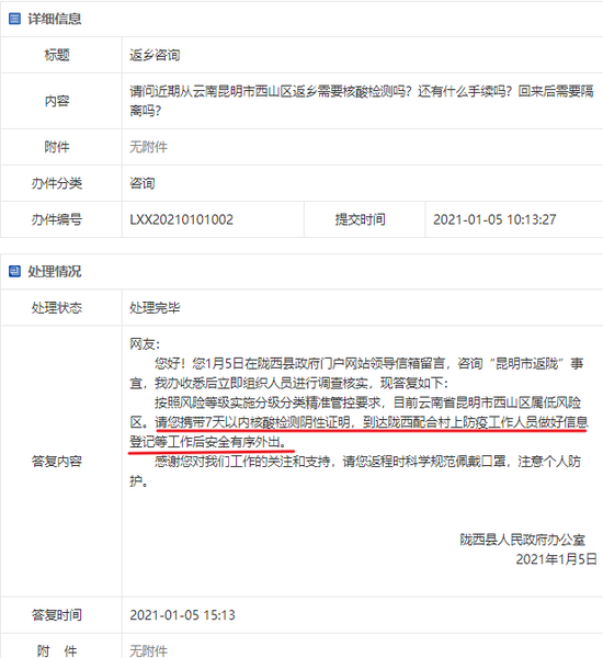 有网友在甘肃陇西县政府网站上咨询,近期从云南昆明市西山区返乡需要核酸检测吗?