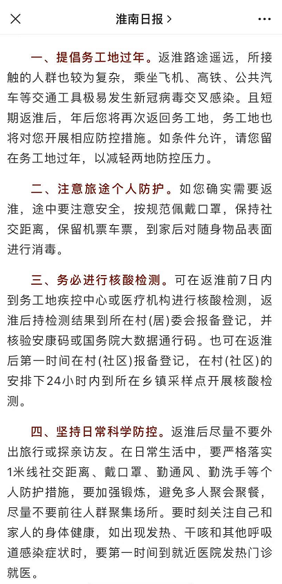1月2日,安徽淮南市在《致淮南籍在省外务工人员的一封信》中表示,如条件允许,提倡务工地过年,以减轻两地防控压力。