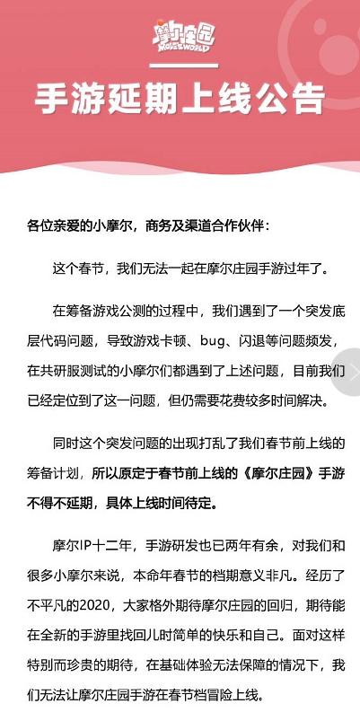 不过,就在游戏上线前夕,《摩尔庄园》项目组突然发布延期上线的公告。