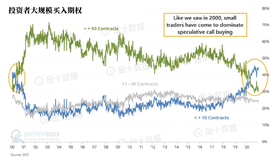 Sundial Capital Research的Jason Goepfert也自12月底以来一直在强调,散户在期权市场上的影响力很大。他引用了期权交易量和期权价格的数据,其中散户参与者占54%,机构参与者占28%。Goepfert在上周二的一份报告中写道: