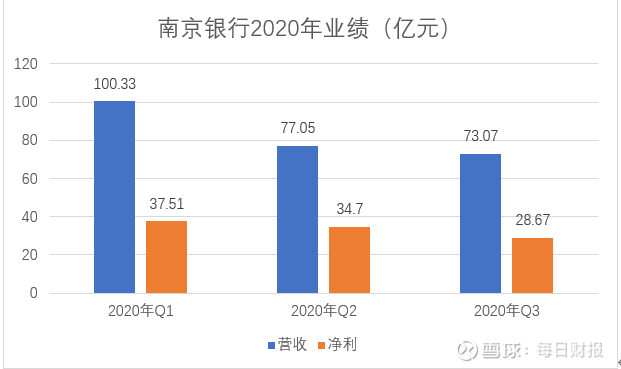 2020年一季度,南京银行实现营入100.33亿元,净利润37.51亿元;第二季度,该行营收为77.05亿元,环比下降23.2%,净利润为34.7亿元,环比下降7.5%。