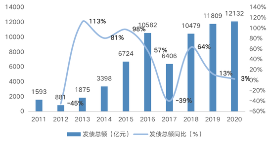 2011~2020年房企债券融资规模及增速 来源:Wind、贝壳研究院