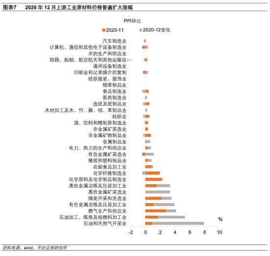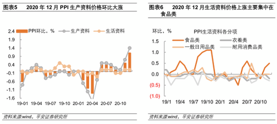 2.2020年12月工业品中,生产资料价格环比大幅升至1.4%,生活资料环比持平于0.1%。生活资料价格主要受到食品类价格拉动,而衣着、耐用消费品和一般日用品价格均环比跌幅扩大或持平,体现下游工业品价格仍显低迷。生产资料价格扩大涨幅,主要体现上游工业原料价格普遍加速上涨。2020年12月,石油产业链、燃气生产供应、黑色有色金属开采冶炼、煤炭开采业价格环比涨幅均明显扩大,而中下游工业品价格环比涨幅较小,尤其下游工业品环比以下跌为主。当前工业品价格从上游行业向下游行业的传导尚不畅通,终端需求不足仍是PPI的压制因素。