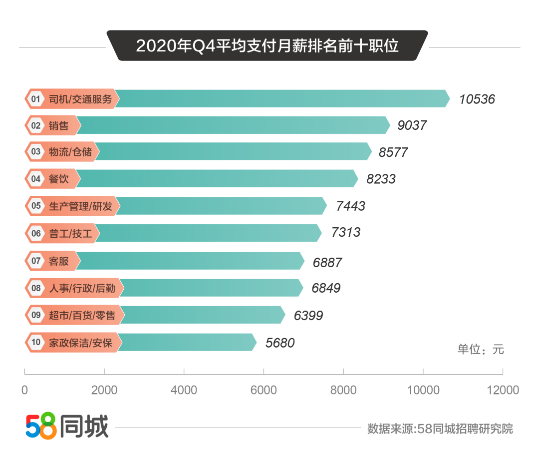 而从职位上看,2020年四季度司机/交通运输岗位企业平均支付月薪10536元,排名第一。其次是销售、物流/仓储职位,月薪分别为9036元、8576元。人事/行政职位企业平均支付月薪同比增长最快,达到22.58%,其次是生产管理/研发类职位同比增长20.68%。受供应需求的影响,司机/交通运输职位的工作量增大,带动收入水平的提高。销售、物流/仓储职位也因市场需求大,具有较高的平均收入。人事/行政职位企业平均支付月薪的快速增长表明随着线上办公的发展,“办公室一族”的人事/行政职位能发挥更大价值,收入水平也相应提高较快。